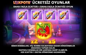 • 3 veya daha fazla Luxpots Biber Bombası Scatter sembolü elde ederek nakit ödüllerin kapısını arala. Unutma, her bir Scatter sembolü bir Ekstra Spin demek.